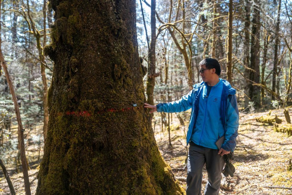 云南麗江森林生物多樣性國(guó)家野外科學(xué)觀測(cè)研究站工程師范中玉在云杉坪大樣地內(nèi)查看一棵杉樹(2024年3月28日攝)。新華社記者 陳欣波 攝