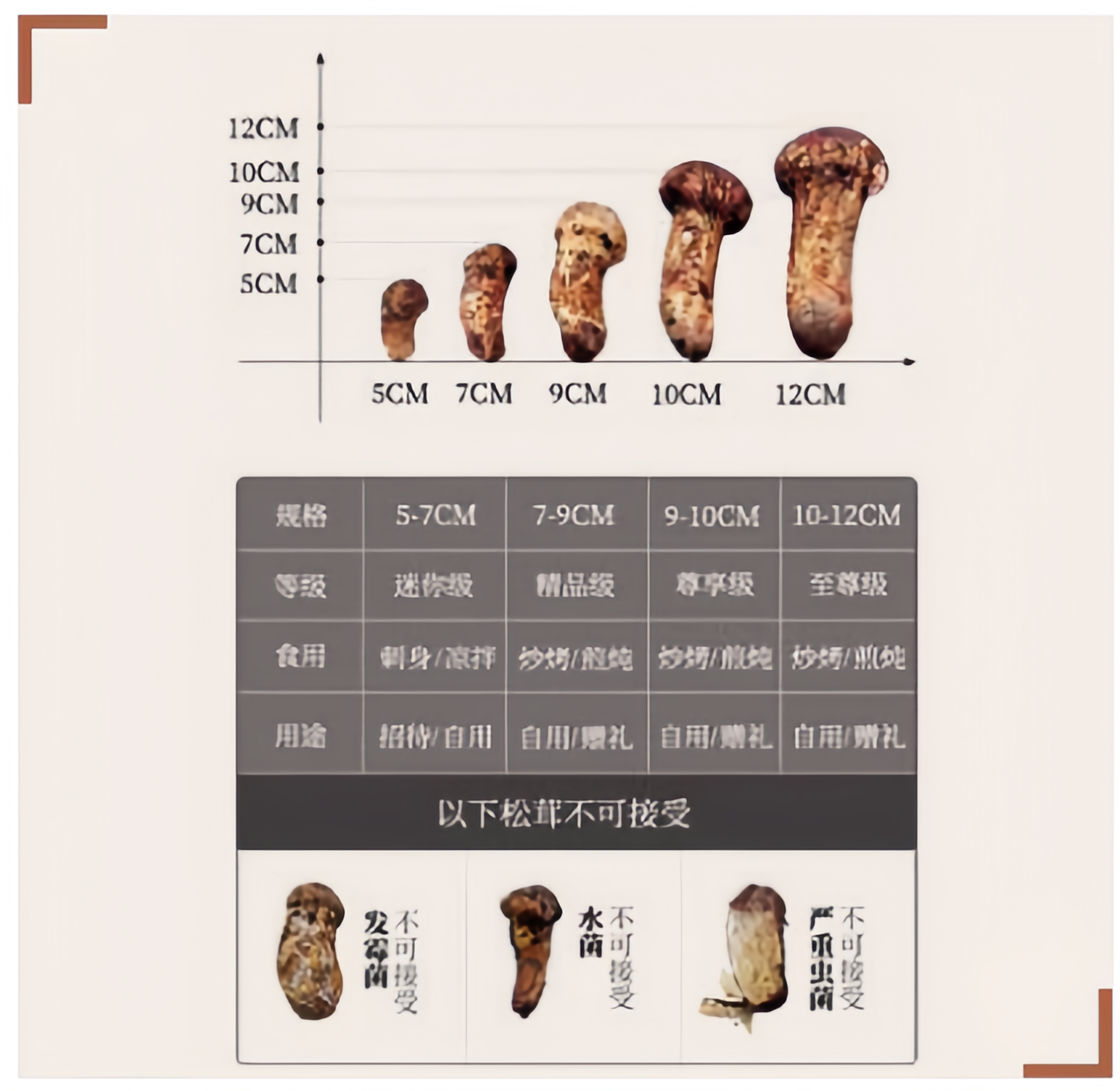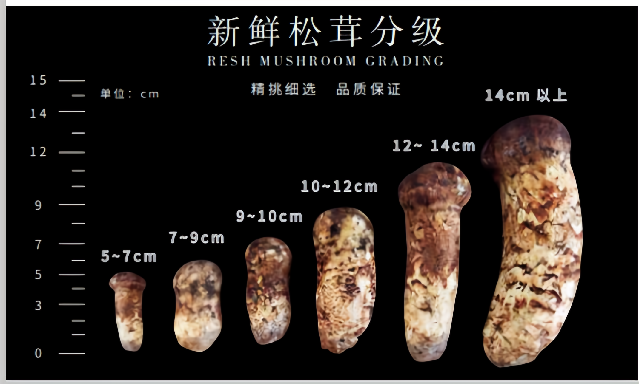 松茸的尺寸大小決定了松茸的價格。3—5厘米為三級松茸、5—7厘米的二級松茸價格比較便宜、7—9厘米及以上的為一級松茸、12厘米的屬于高端品質(zhì)松茸、12厘米以上的松茸則屬至尊之選,菌朵的重量越重、菌傘含苞為最上品,若菌傘完全撐開,香味會大量逸失。