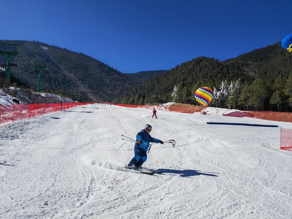 2024年12月28日,游客在云南省迪慶州香格里拉市的七星雪滑雪場滑雪。新華社記者 浦超 攝