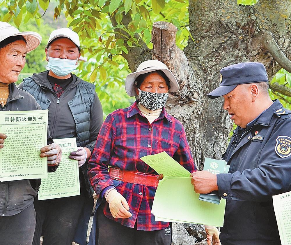 江巴次成(右)向村民宣講防火知識。 本報(bào)記者 貢秋次仁 攝