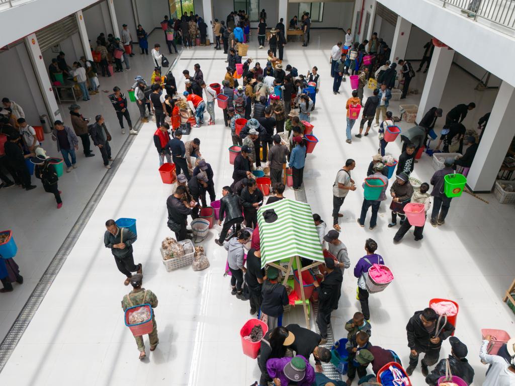 下午2點,吉迪村松茸交易市場準時開始交易。身著粗布藏裝的老人背著背簍、拎著袋子涌進交易大廳,報價、驗貨、稱重一氣呵成,最快兩分鐘就能完成交易,而他們當天采摘的松茸也迅速通過冷鏈車發(fā)往各地。