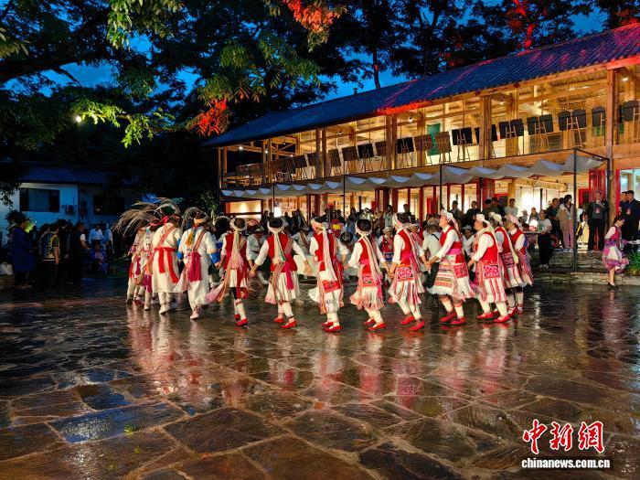 和新海組建的民族歌舞表演隊在啟別村表演傈僳族舞蹈阿尺木刮。受訪者 供圖