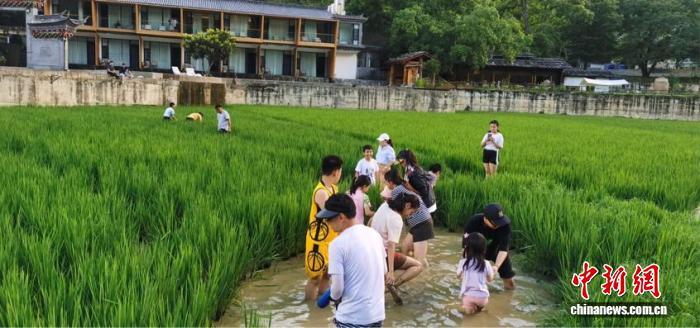 親子游客在啟別村稻田間體驗摸魚。受訪者 供圖