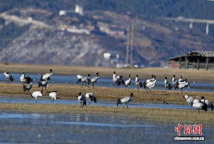 1月7日,一群黑頸鶴在納帕海覓食。陳志明 攝
