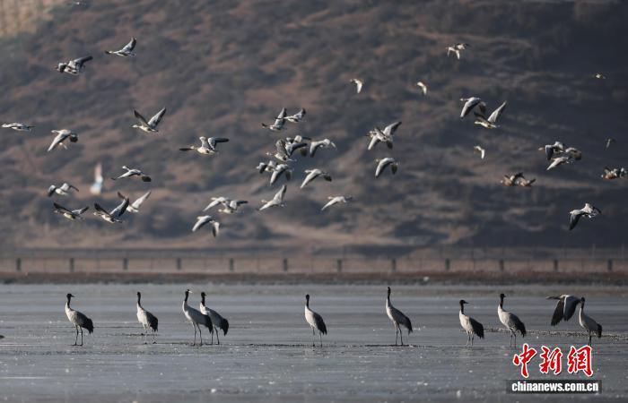 1月23日,黑頸鶴與斑頭雁在納帕海共舞。黃興鴻 攝