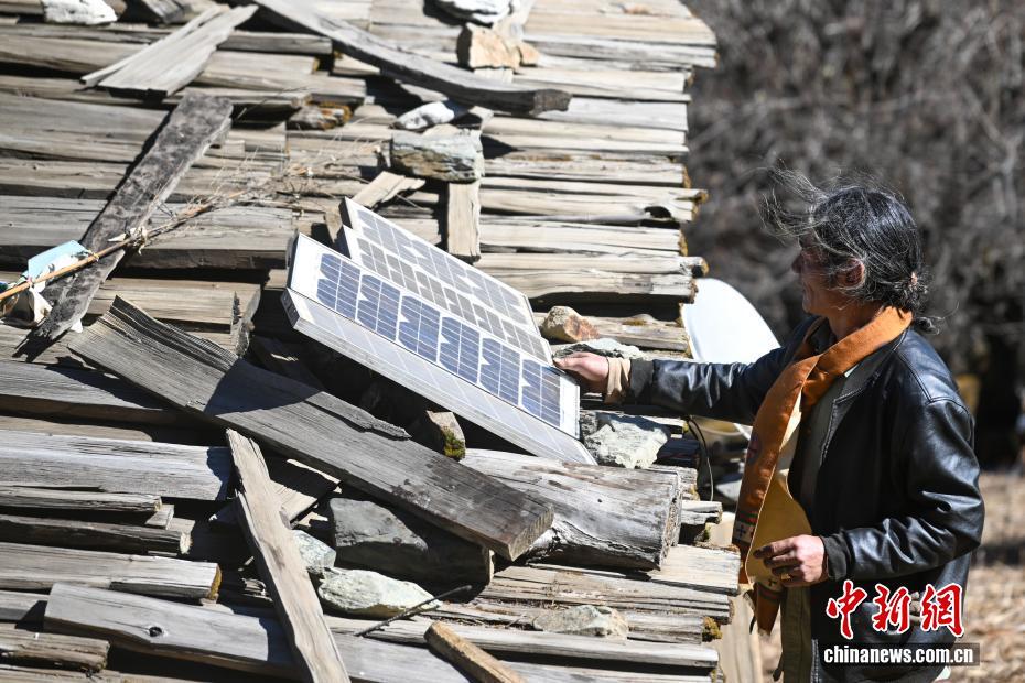 圖為1月27日,丹增培楚正在擺弄小木屋頂?shù)奶柲馨?。中新社記者 李嘉嫻 攝