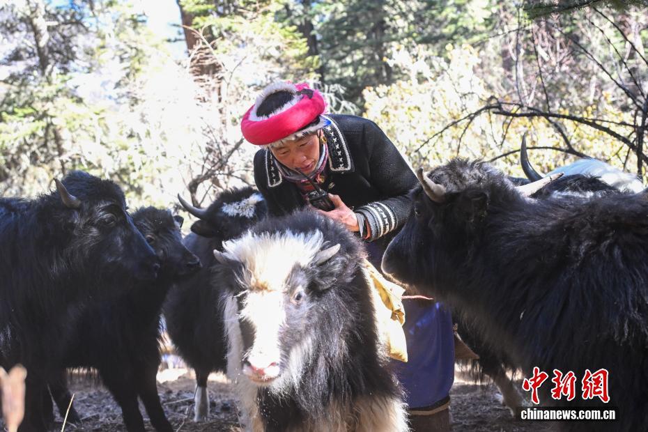 圖為1月27日,七林央宗在照看牦牛的同時(shí)用對講機(jī)與丈夫聊天。中新社記者 李嘉嫻 攝