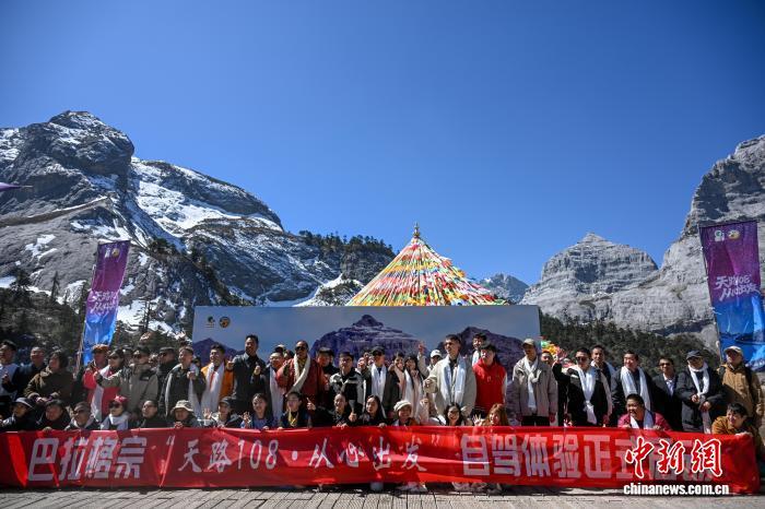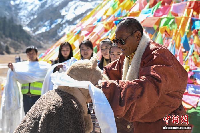 3月11日,巴拉格宗景區(qū)創(chuàng)始人斯那定珠(左一)為首批體驗(yàn)自駕的游客獻(xiàn)哈達(dá)。中新社記者 李嘉嫻 攝