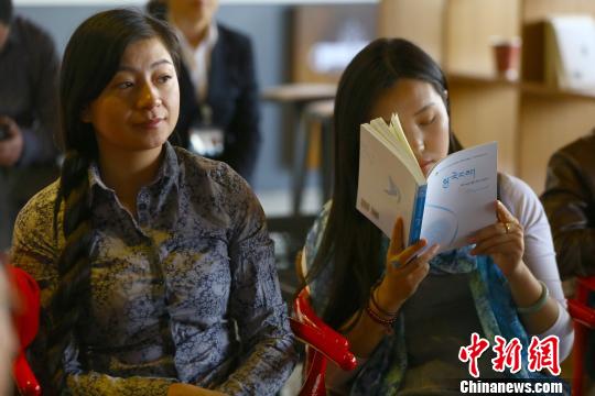 1日,當(dāng)代藏族女作家叢書第二部在青海西寧舉行首發(fā)儀式。圖為一名讀者正在閱讀完么措詩(shī)集《水之韻》。 羅云鵬 攝