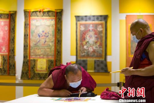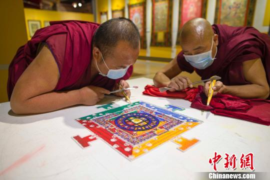 兩名僧人正在制作壇城沙畫(huà)。張?jiān)?攝