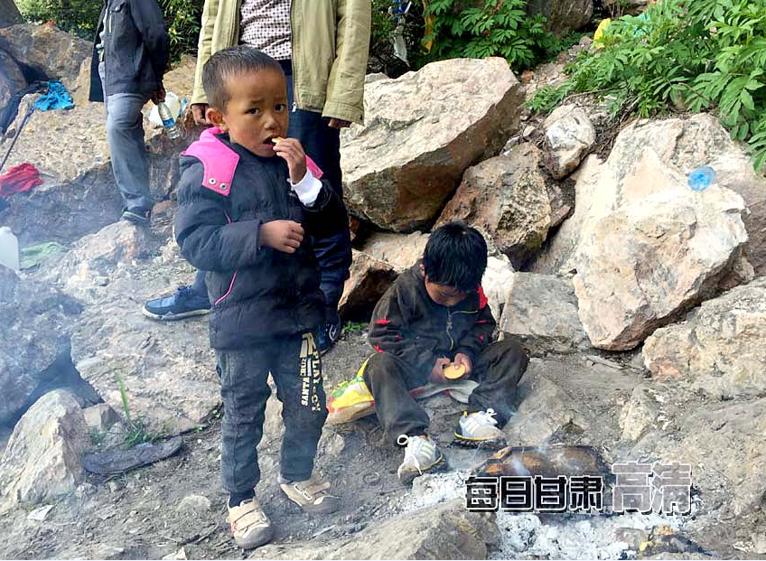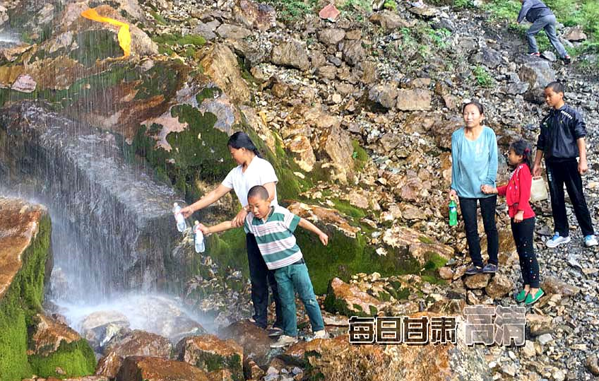 路途中,記者看到許多附近村子的村民背著水桶,向著“曲紗”一步步邁進,朝水完帶些“圣水”給家中不能來的老人、孩子。到達山頂后,虔誠的村民按順時針方向繞著“曲紗”瀑布走三圈,同時唱誦著嗡(ong)嘛(ma)呢(ni)唄(bei)咪(mei)吽(hong)六字真言。也有好多小朋友伴隨在父母身邊,雙手接著“圣水”洗臉、飲用。路上遇到一對夫婦,六十多歲了,大早坐著三輪車出發(fā),走了很久趕過來,只為祭拜山神、沐浴圣水,祈福平安健康。記者也入鄉(xiāng)隨俗,體驗了一把“圣水浴”,清涼的山泉水打在身上,頓時神清氣爽,捧一把送入口中清甜無比。