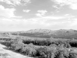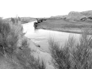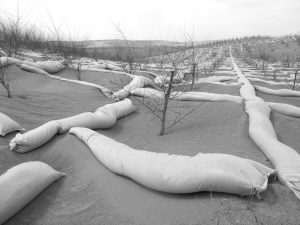 在共和縣林業(yè)局局長趙久文的帶領(lǐng)下,我們沿著車轍軋出來的便道向沙漠深處行進(jìn)。初春季節(jié),枝椏開始泛綠,遠(yuǎn)處,凡是有村莊的地方就有片片叢林,荒漠的土地上布滿沙障。一路隨處可見豎立的標(biāo)語牌,上面書寫著各種治沙的警示語。在廿地鄉(xiāng)切扎村沙丘人工造林區(qū),株株烏柳小樹苗在一排排一行行方格沙障的護(hù)衛(wèi)下向沙山沙丘延伸。沙障就是用麥草把沙固定成一個(gè)個(gè)的方格,使沙不能再流動(dòng),然后在方格里播撒草種或種上灌木。放眼西望,無邊無際漫漫荒漠,目光所及均是高矮不等或疏或密的各種植物。這樣大面積的治沙,完全靠人工所為,其工程的浩大和艱難令人感慨。