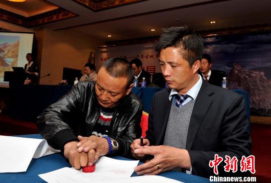 4月14日,日喀則市江孜縣副縣長何斌(圖右)與旅行社代表簽訂2016年獎勵協(xié)議。 李林 攝