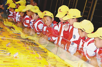 圖為拉薩市堆龍德慶區(qū)姜昆希望小學(xué)的學(xué)生們在西藏甘露藏藥股份有限公司文化展區(qū)觀看藏醫(yī)藥器材。