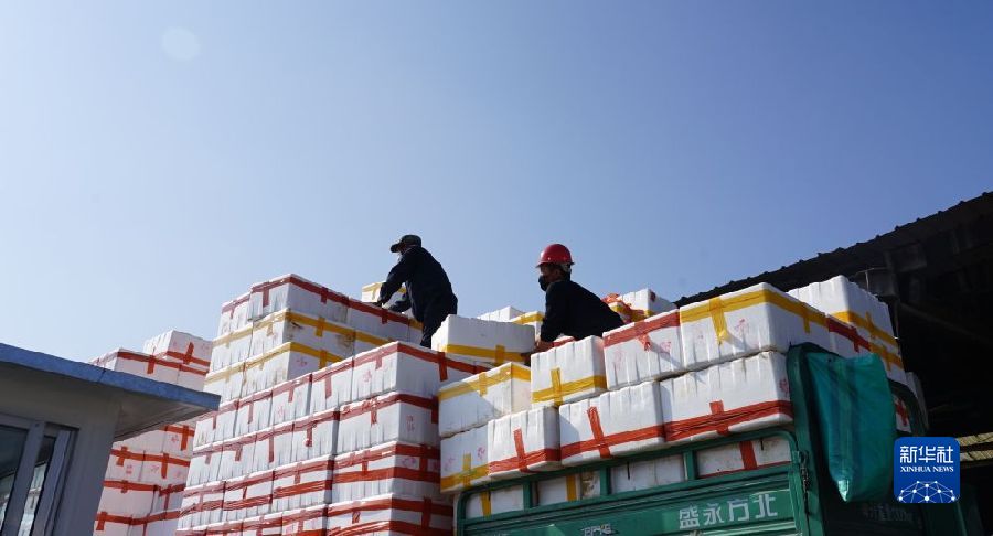 這是青藏高原農(nóng)副產(chǎn)品集散中心,工作人員正在搬運裝有蔬菜的貨運箱。(新華社記者 李寧 攝)
