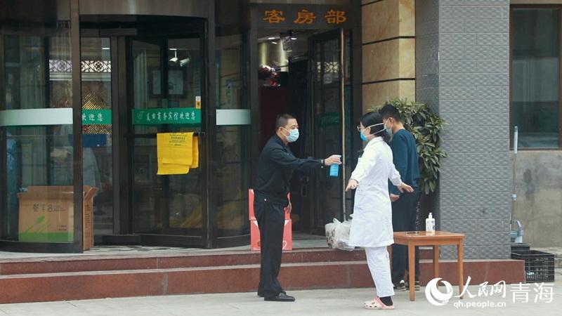 隔離點醫(yī)護人員前來取餐。人民網(wǎng) 張皓芃攝
