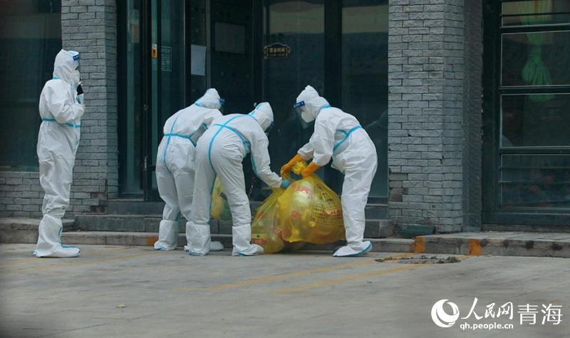 隔離點內(nèi),工作人員正在清理垃圾。人民網(wǎng) 張皓芃攝