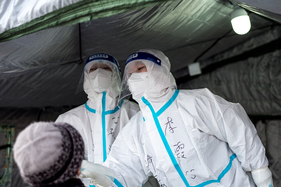 11月8日,在西寧市中心廣場(chǎng)核酸采樣點(diǎn),醫(yī)護(hù)人員冒著嚴(yán)寒做核酸采樣。新華社記者 吳剛 攝