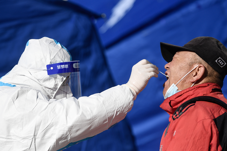 11月8日,在青海省西寧市城西區(qū)寶豐綠洲采樣點(diǎn),醫(yī)護(hù)人員為市民進(jìn)行核酸采樣。新華社記者 張龍 攝