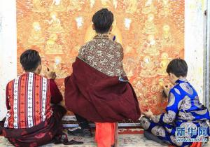 我叫桑杰加,今年35歲,我的家鄉(xiāng)吾屯上莊被譽(yù)為“世界唐卡之都”。我6歲時(shí),跟隨著名熱貢藝人更登達(dá)吉學(xué)習(xí)唐卡,經(jīng)過10年苦學(xué),我基本上掌握了熱貢唐卡的傳統(tǒng)技法。