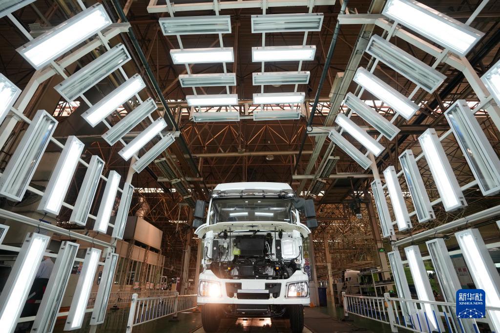 5月24日,在陜西汽車(chē)控股集團(tuán)有限公司總裝車(chē)間,一輛裝配完畢的陜汽重型卡車(chē)等待驗(yàn)收。 新華社記者 李一博 攝