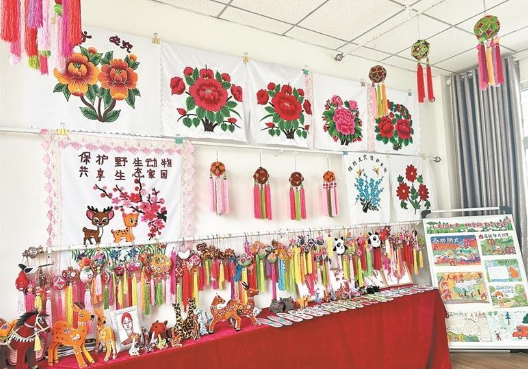 執(zhí)法檢查即將結束時,一個臨時安排的檢查點——老虎溝管護站,讓我們眼前一亮。二樓“生態(tài)文明宣傳教育室”墻上掛著的一排排香包上繡著雪山云杉,剪紙里躍動著巖羊的身影,手工擺件將野生動物的形象“可愛化”……最動人的是側邊展板上孩子們的畫作,看上去稚嫩的筆觸里,藏著對這片山林最純真的熱愛。