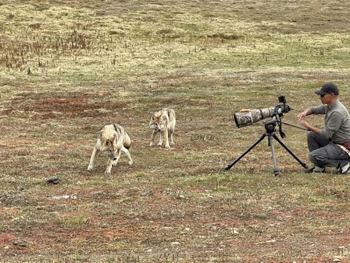 視頻中,塔先杰專注地架設(shè)鏡頭,試圖捕捉野生動物的蹤跡。而就在他身旁,幾匹野狼悠然自得地來回走動,它們的神態(tài)自若,仿佛與塔先杰之間存在著一種無形的默契。這幅畫面如同一首無聲的詩,向我們展示了大自然的和諧之美,讓人不禁感嘆生命的奇妙與偉大。