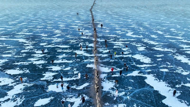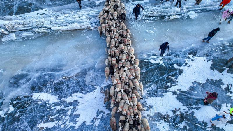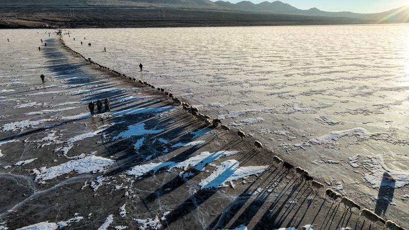 去往湖心島的路程大約3公里,走在冰面上,偶爾響起的冰層破裂聲還是讓人不由得心驚。此刻,幾百只羊宛如一條長(zhǎng)長(zhǎng)的直線,在牧羊人的指揮下緩慢前行。金色的太陽露出地平線,羊群的影子投射在藍(lán)色的冰面上,美不勝收。