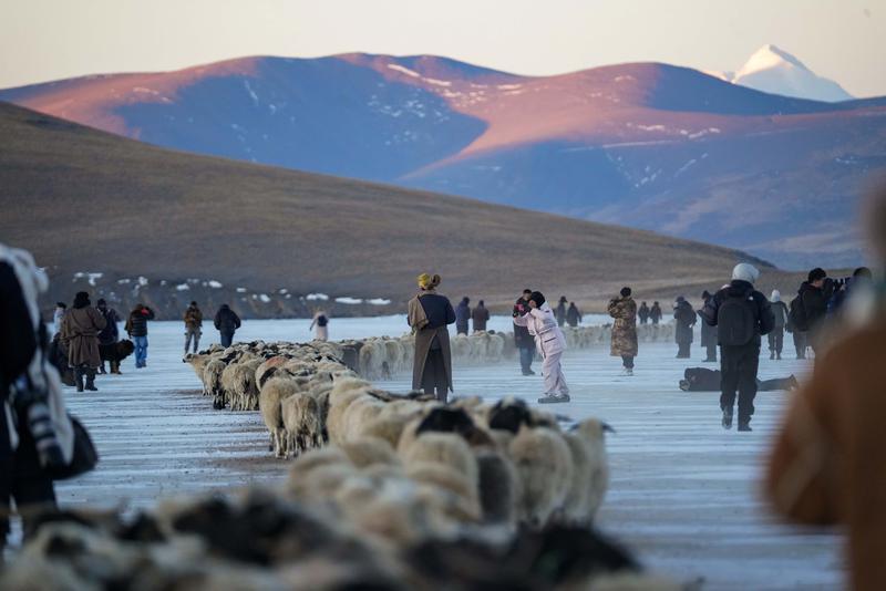 年復(fù)一年,驚艷又震撼的“冰上趕羊”盛宴,在普莫雍措已上演了千年。這一獨(dú)特的自然人文景觀構(gòu)成了冬日里絕美的風(fēng)景,也吸引著眾多游客前來打卡。