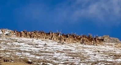 白唇鹿,以其獨特的形態(tài)和珍稀的種群數(shù)量,被譽為青藏高原上的“精靈”。它們通常分為雌性群、雄性群以及混合群等三種類型。雄性群中的個體數(shù)量相對較少,最大的群體不超過8只;而混合種群則不分年齡、性別,主要出現(xiàn)在繁殖期。此次加羊多杰拍攝到的混合種群規(guī)模如此之大,實屬罕見。