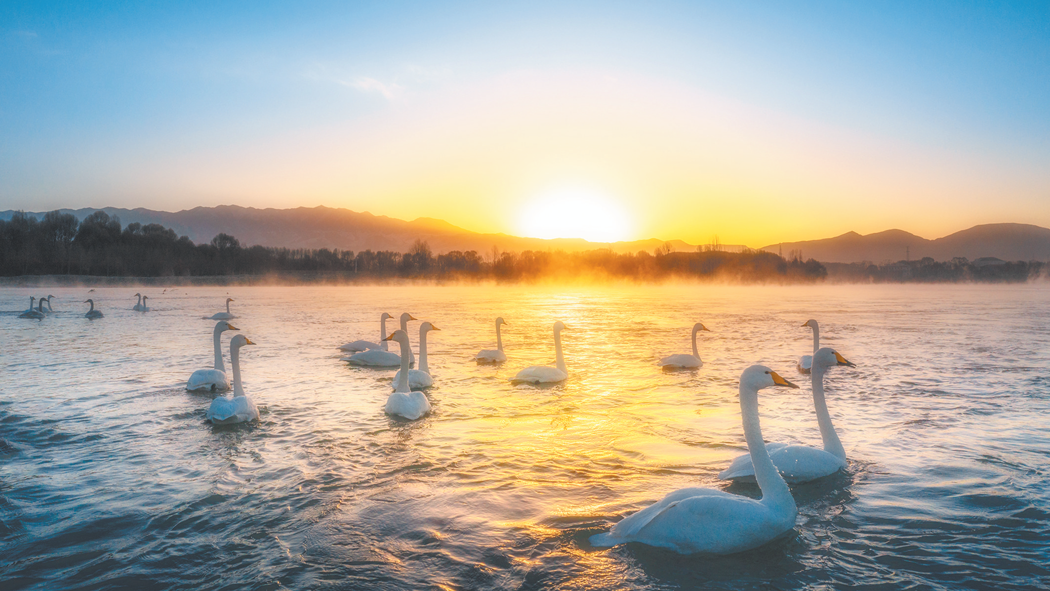 在河畔、在濕地、在灘涂,總會(huì)看到成群的白天鵝翩然而至,它們或悠然游弋,或引頸高歌,潔白的羽毛在陽光的照耀下閃爍著柔和的光,幻化成冰雪世界中的白色精靈,構(gòu)成一幅山、水、鳥和諧靈動(dòng)的美麗畫卷。