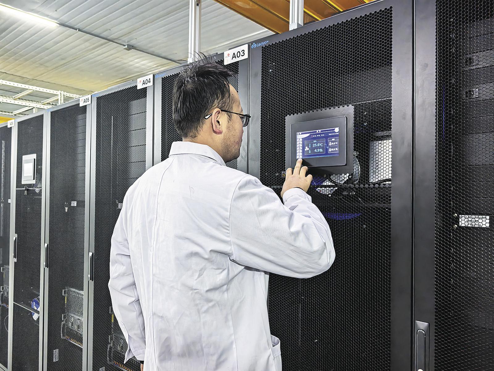 三江源綠電智算融合示范園運維人員查看設(shè)備運行情況。記者 王菲菲 攝