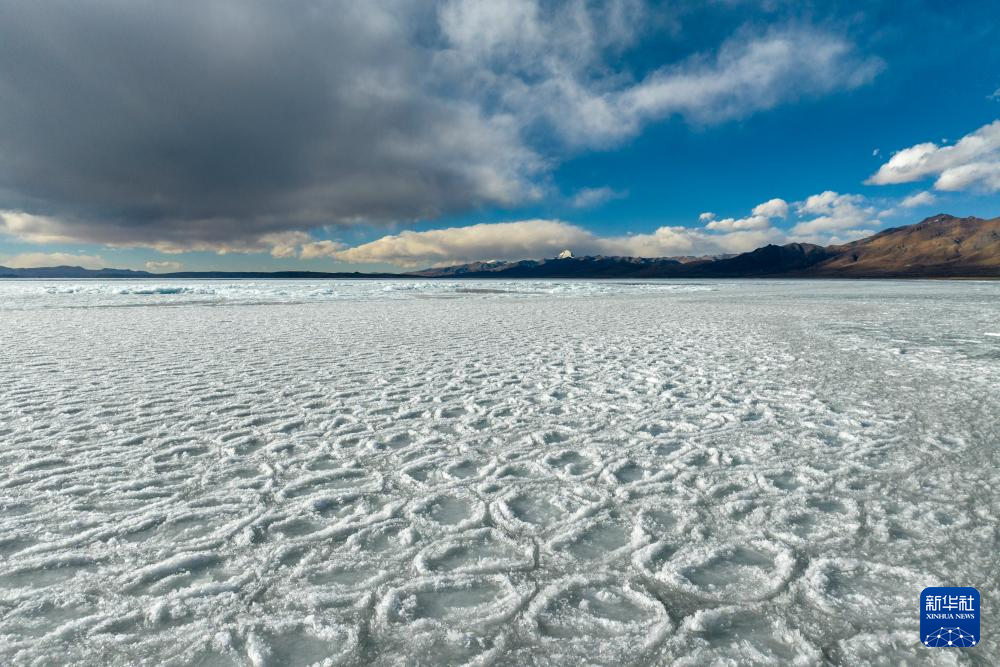瑪旁雍錯(cuò)湖面上的冰堆積在一起,形似波浪(1月29日攝)。新華社記者 關(guān)明輝 攝 ??
