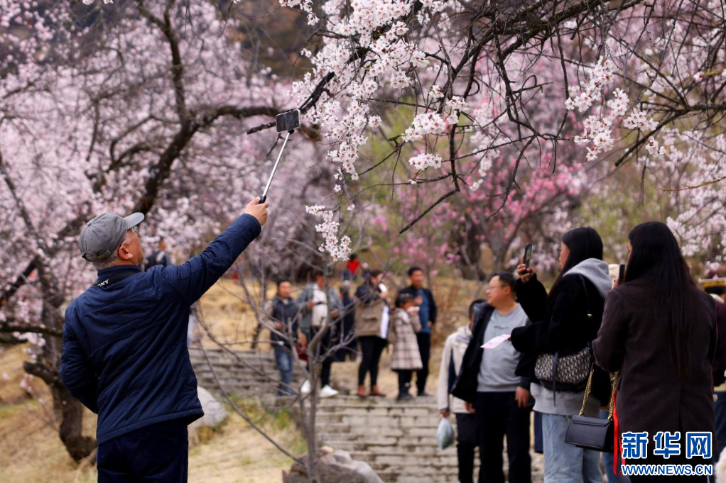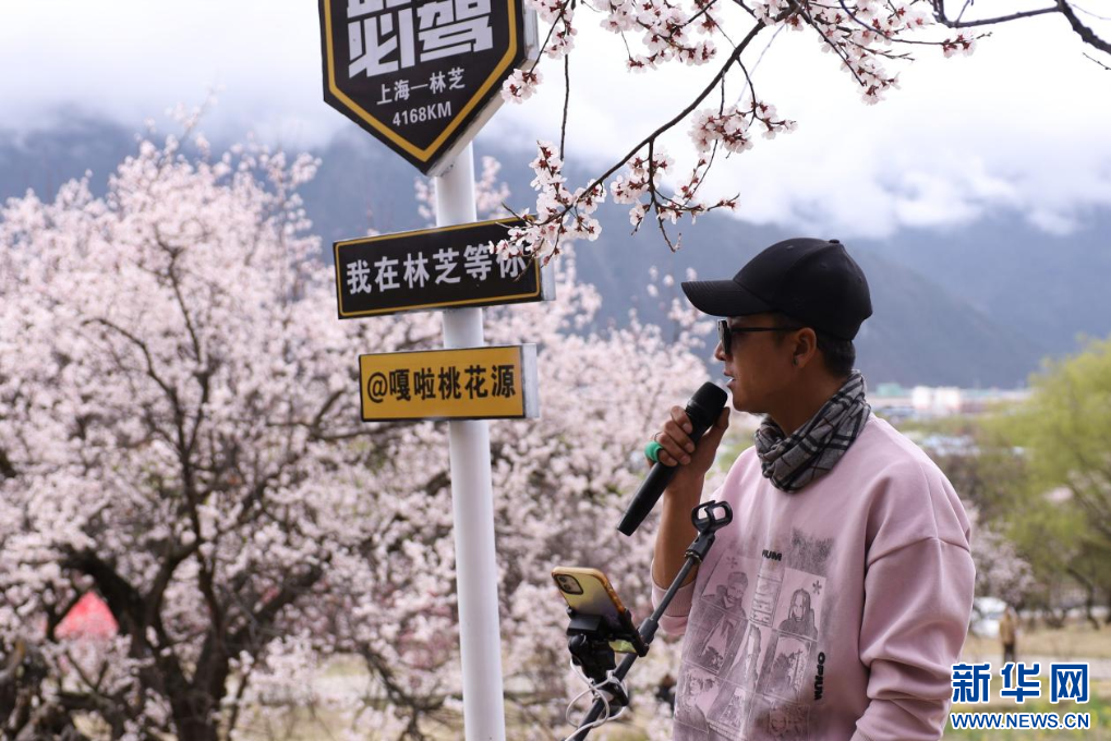 3月31日,游客在林芝市巴宜區(qū)嘎拉村進行線上直播。新華網(wǎng)發(fā) 李騰 攝