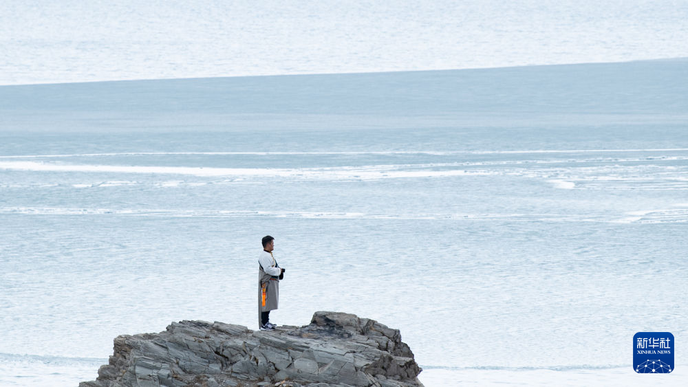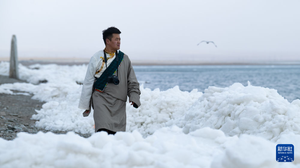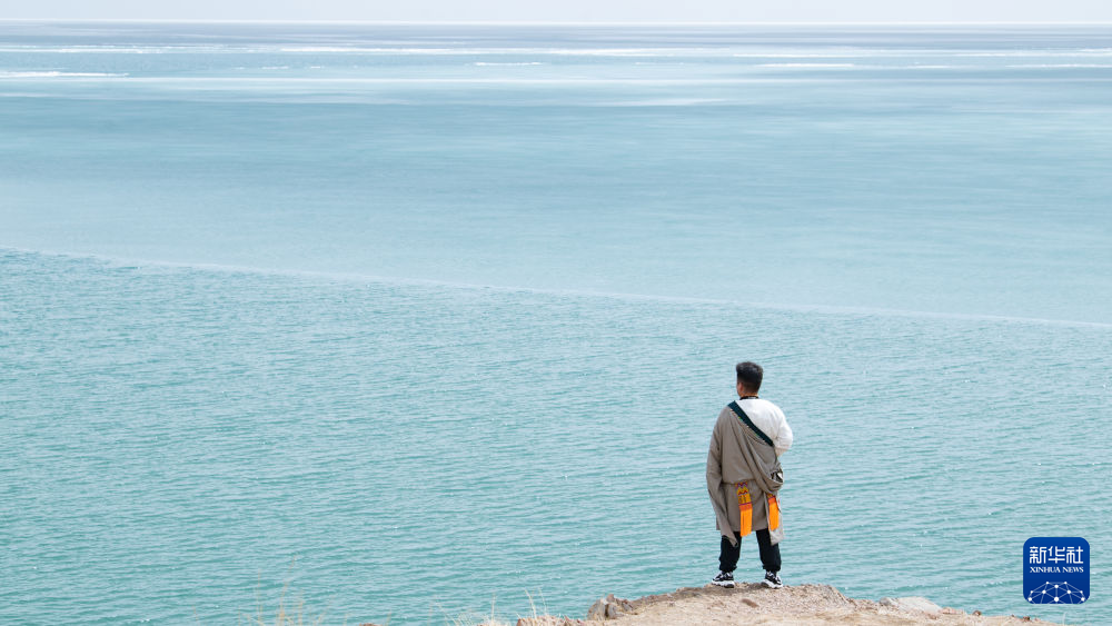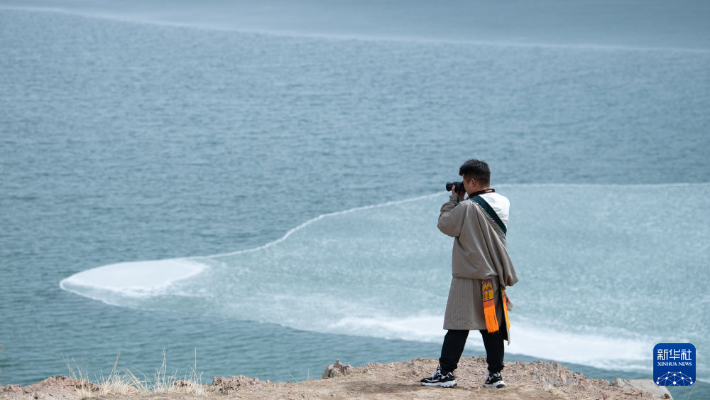 青海省海北藏族自治州剛察縣牧民多杰觀察青海湖開湖情況(4月3日攝)。新華社 王浡 攝
