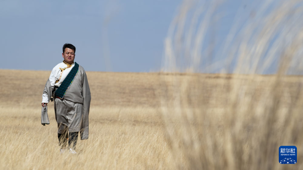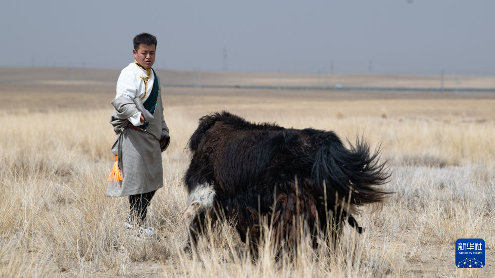 青海省海北藏族自治州剛察縣牧民多杰行走在放牧途中(4月3日攝)。新華社 潘彬彬 攝