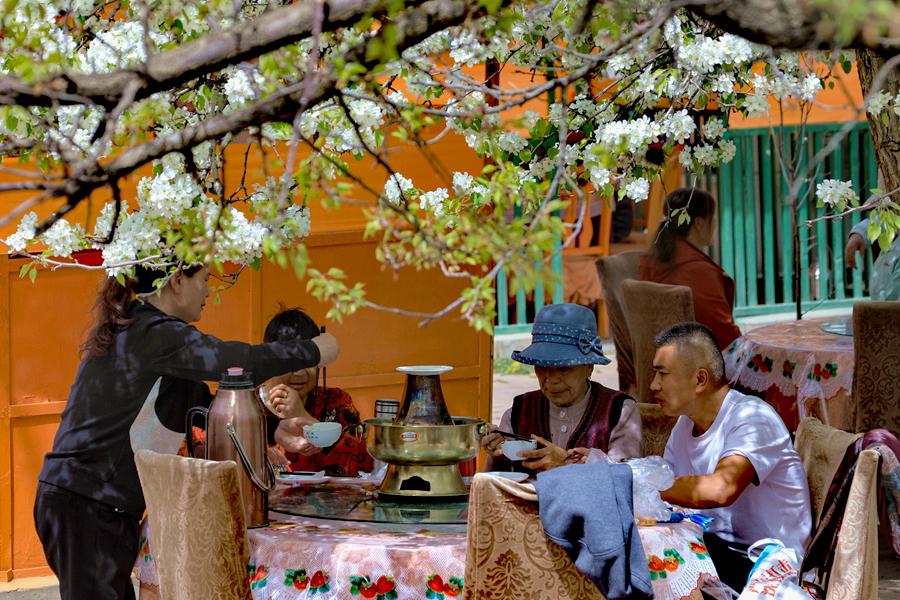 游客在梨花盛開的農(nóng)家樂內(nèi)聚餐。新華網(wǎng) 黃開森 攝