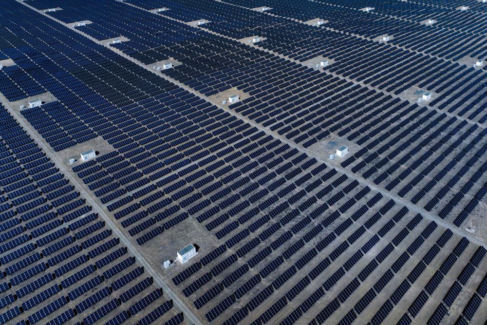 345平方公里的發(fā)電園內(nèi),超過(guò)1000萬(wàn)塊光伏板高低起伏連成蔚藍(lán)色的“海洋”,年發(fā)電量超過(guò)200億千瓦時(shí),相當(dāng)于減排二氧化碳超過(guò)2122萬(wàn)噸。