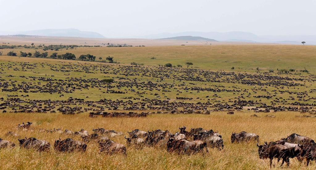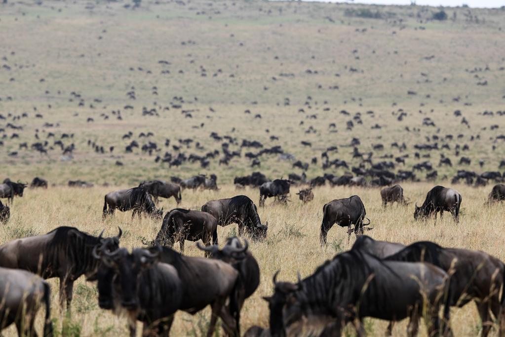 在馬賽馬拉國家保護(hù)區(qū),遷徙中的野生動(dòng)物在草原上覓食。