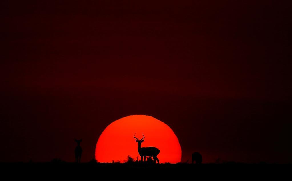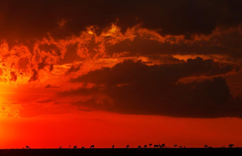 在馬賽馬拉國家保護(hù)區(qū),遷徙中的野生動(dòng)物在夕陽下覓食。