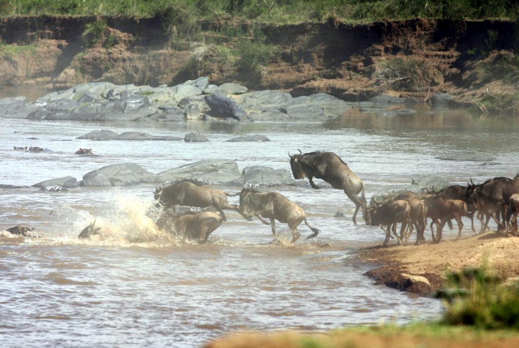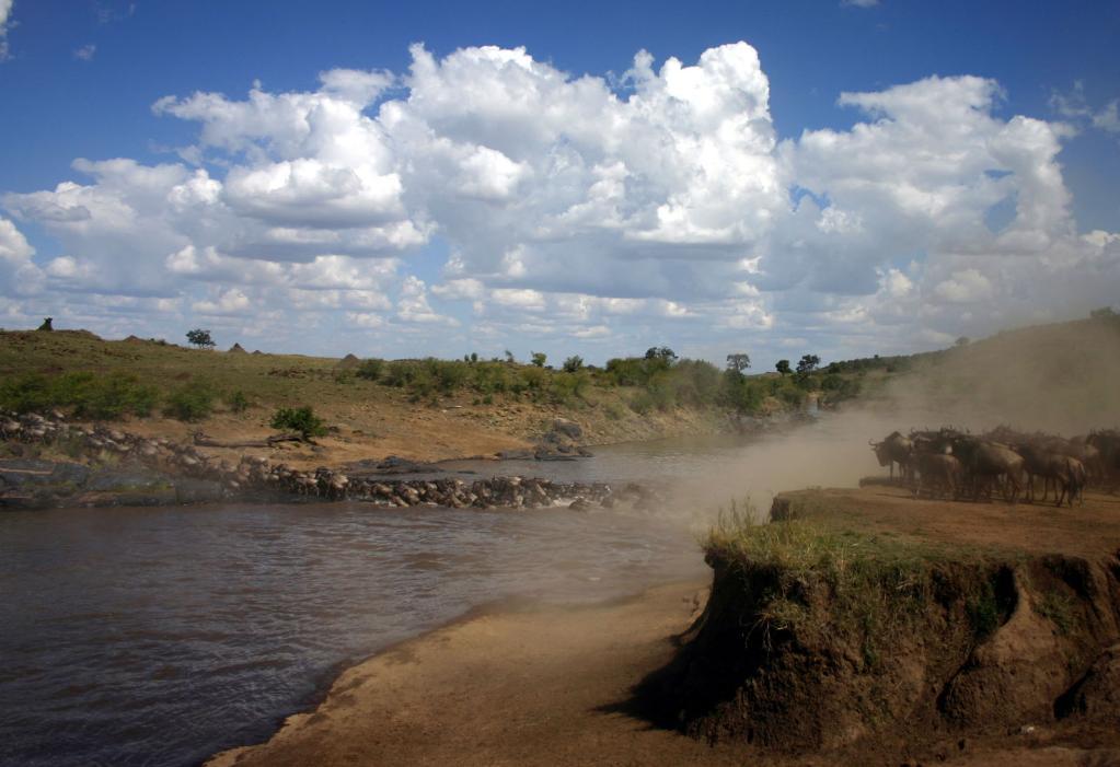 在馬賽馬拉國家保護(hù)區(qū),遷徙中的角馬越過馬拉河。
