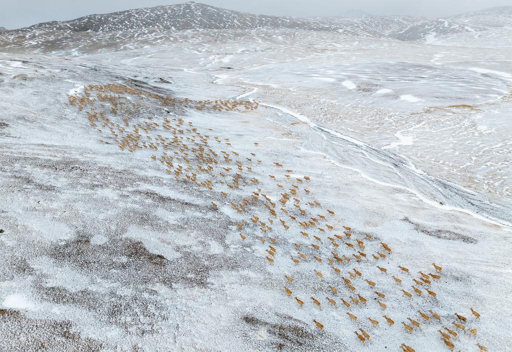 2024年5月10日,在羌塘國家級自然保護(hù)區(qū),大群懷孕的雌性藏羚羊開始集結(jié)成群,向產(chǎn)羔地遷徙。