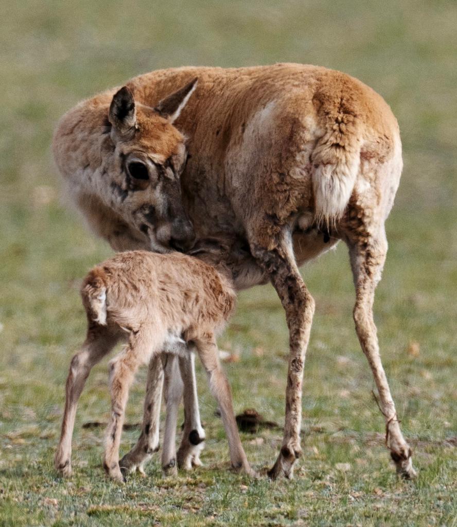 2024年6月17日,羌塘國家級自然保護(hù)區(qū)境內(nèi)的西藏那曲市申扎縣買巴鄉(xiāng)魯確塘草原上一只剛出生不久的小藏羚羊在吃奶。