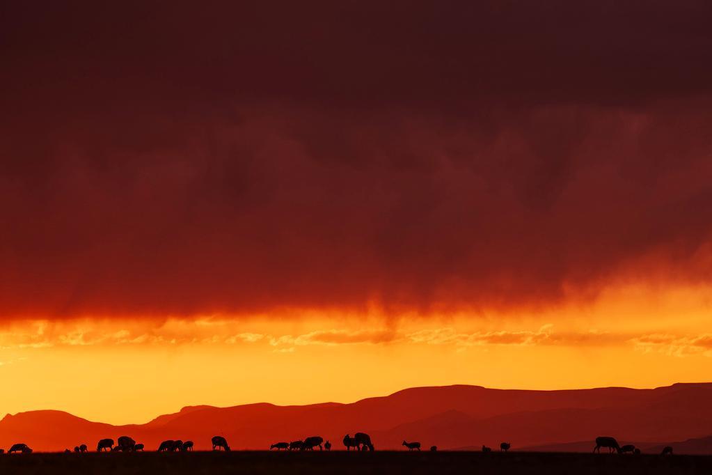 在羌塘國家級自然保護(hù)區(qū),藏羚羊在夕陽下覓食。
