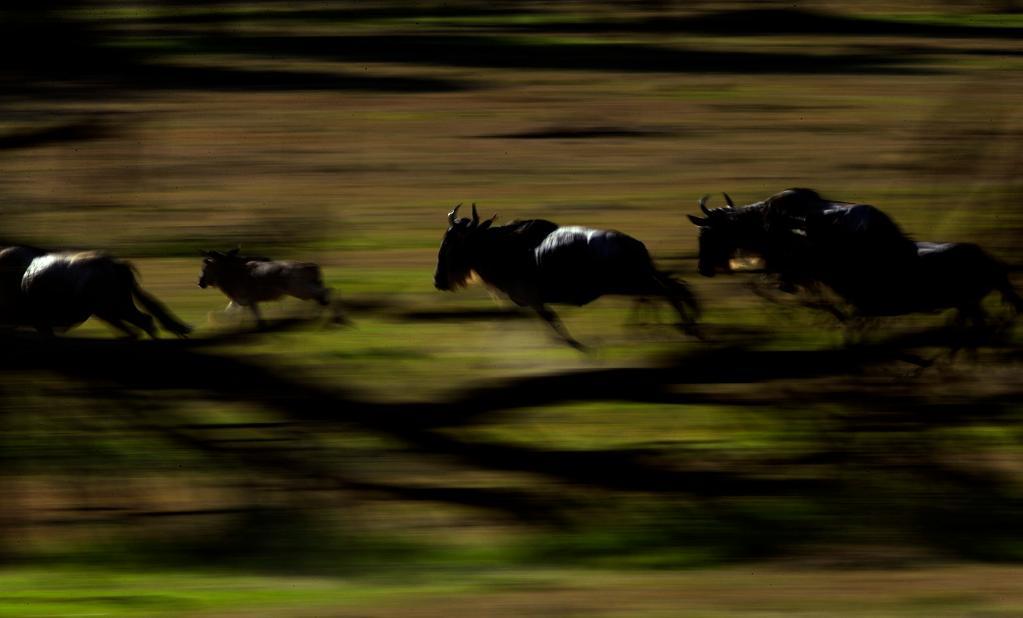 在馬賽馬拉國家保護(hù)區(qū),遷徙中的角馬因?yàn)楦惺艿侥撤N危險(xiǎn)而奮力奔跑。