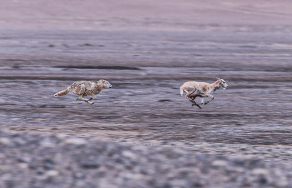 在羌塘國家級自然保護(hù)區(qū),一只野狼正在捕食遷徙中的母藏羚羊。在藏羚羊的遷徙過程中,野狼、雪豹、藏馬熊和藏野狐等掠食動(dòng)物守候在遷徙路上,隨時(shí)準(zhǔn)備捕食。