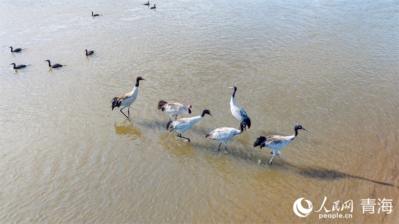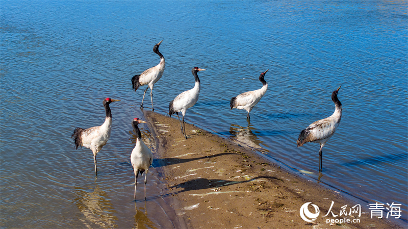 黑頸鶴成群起舞。人民網(wǎng) 況玉攝