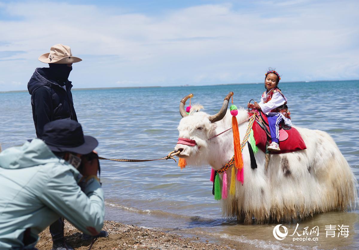 上班時(shí)間到,尕瑪本牽著白牦牛來(lái)到了青海湖景區(qū)的西湖灘,與其他村民家的二三十頭白牦牛排排站立在湖邊,靜待游客前來(lái)觀賞、騎行、拍照。