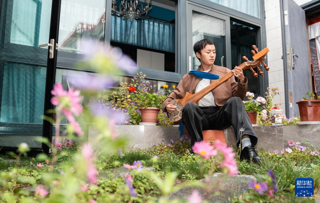 班珠丹塔在家中設(shè)計(jì)藏裝間隙彈奏扎念琴(9月11日攝)。新華社記者 丁增尼達(dá) 攝