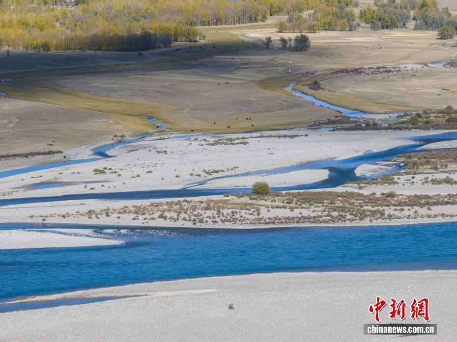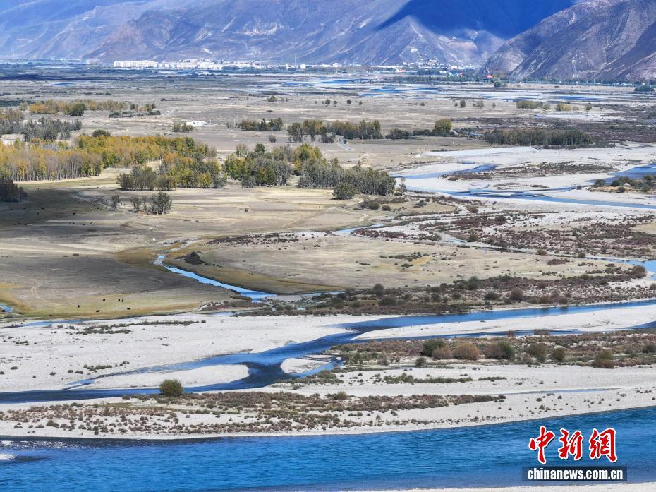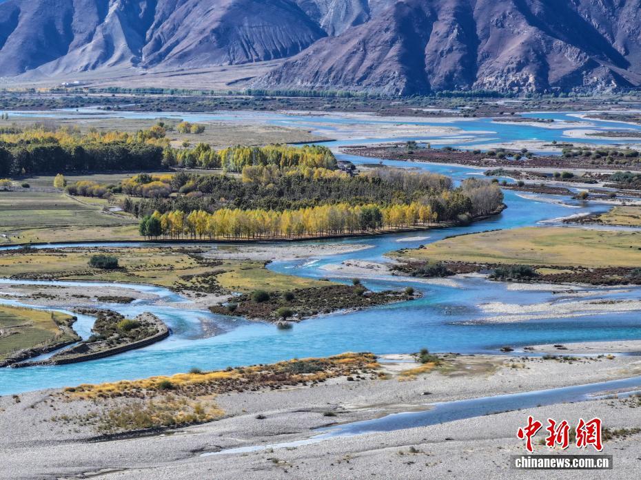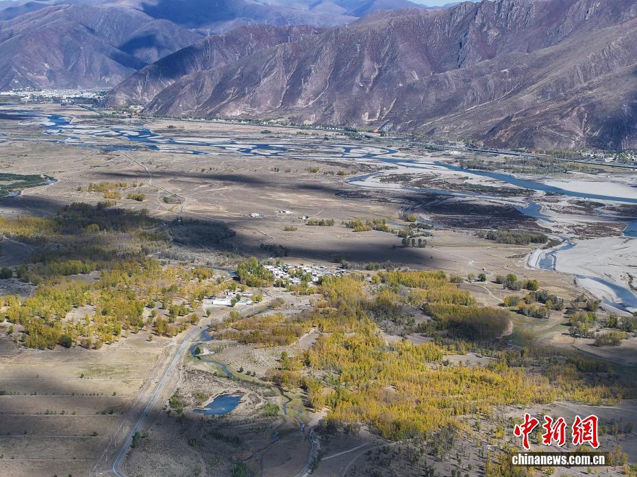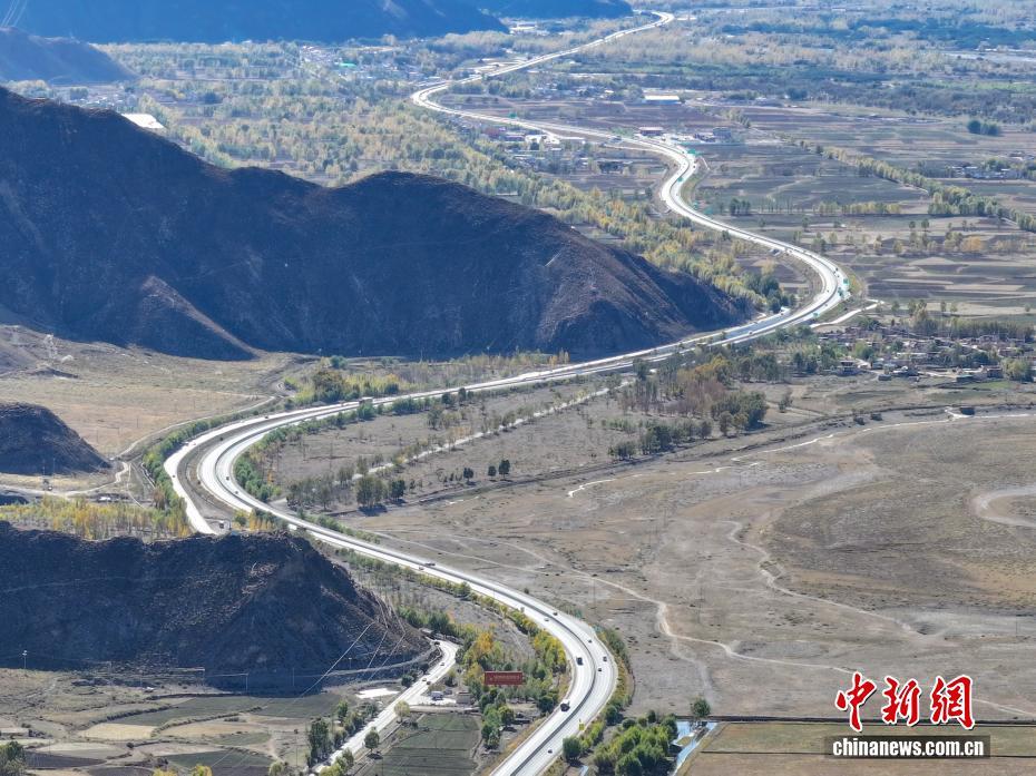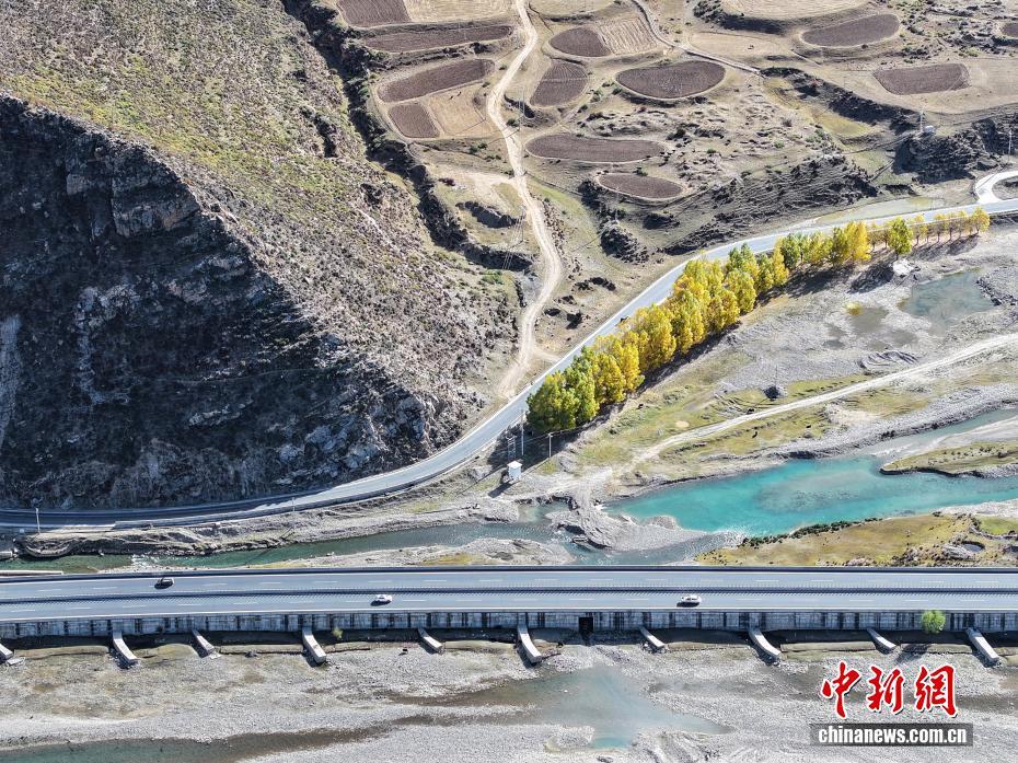 10月15日,西藏自治區(qū)拉薩市墨竹工卡縣境內(nèi)的拉薩河兩岸進入最美秋季,澄澈河水映襯著藍天白云,沿線村莊與拉薩至林芝高等級公路相映成趣,美景如畫。(無人機照片)中新社記者 貢嘎來松 攝